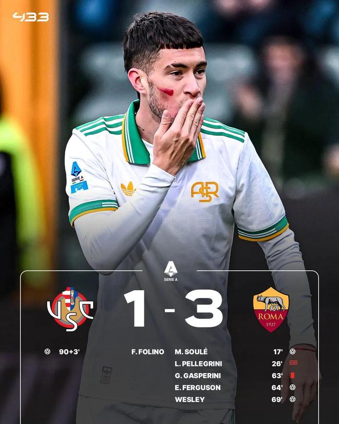 主场作战的克雷莫内塞在伤停补时阶段打进一球,最终,罗马客场3-1取胜,登顶意甲积分榜!